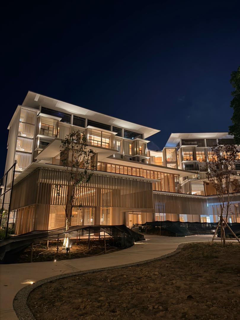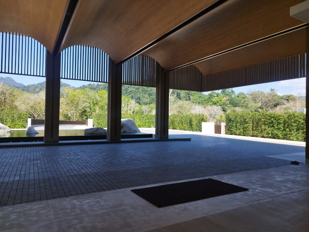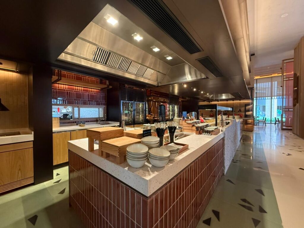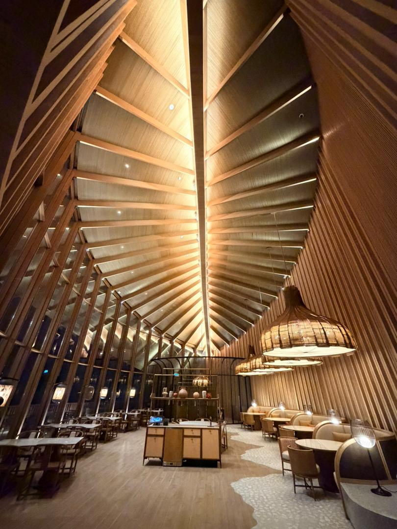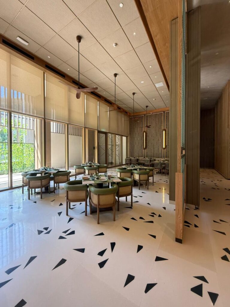 Large glazed openings allow natural light to penetrate the space, enhancing brightness and strengthening the indoor-outdoor relationship. Perforated screens provide shading while maintaining openness, resulting in a balanced and comfortable tropical hospitality environment.