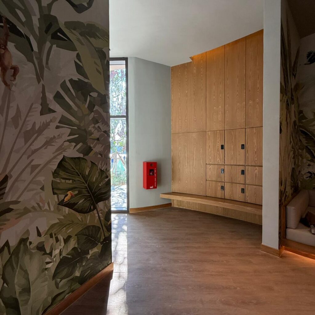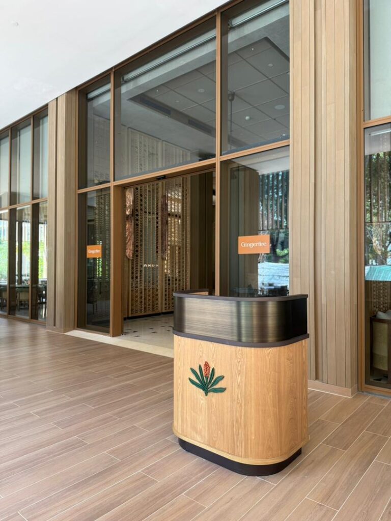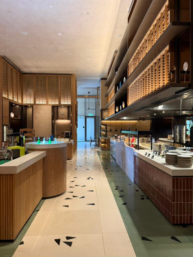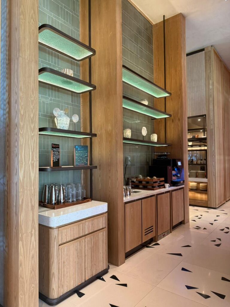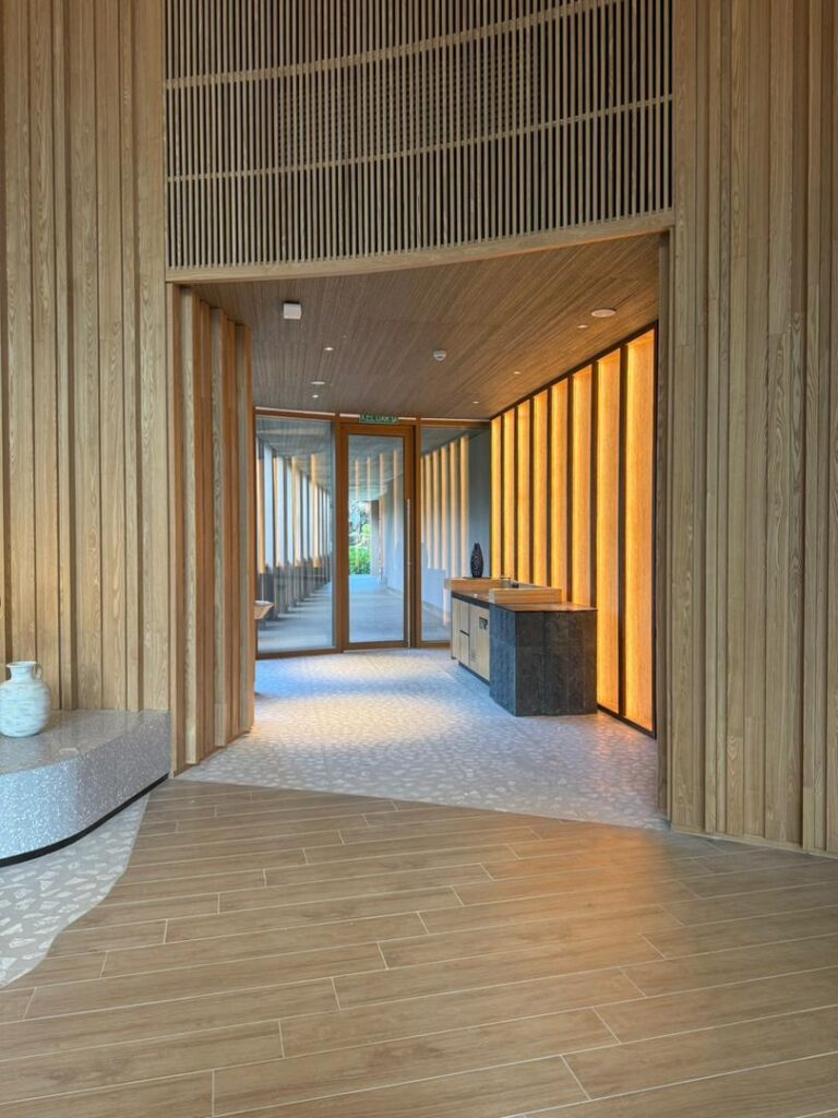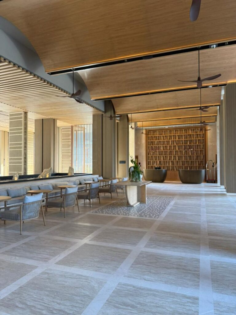 Natural materials play a key role in defining the interior character. Timber finishes, soft upholstery, and woven textures are used to create a cohesive and inviting atmosphere that aligns with the tropical resort identity.