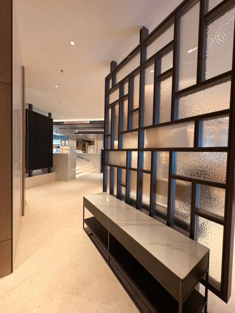 The design introduces new partitions, feature walls, and bespoke elements that enhance spatial flow while maintaining openness. Timber finishes, metal accents, and integrated lighting create a warm, contemporary atmosphere.